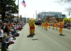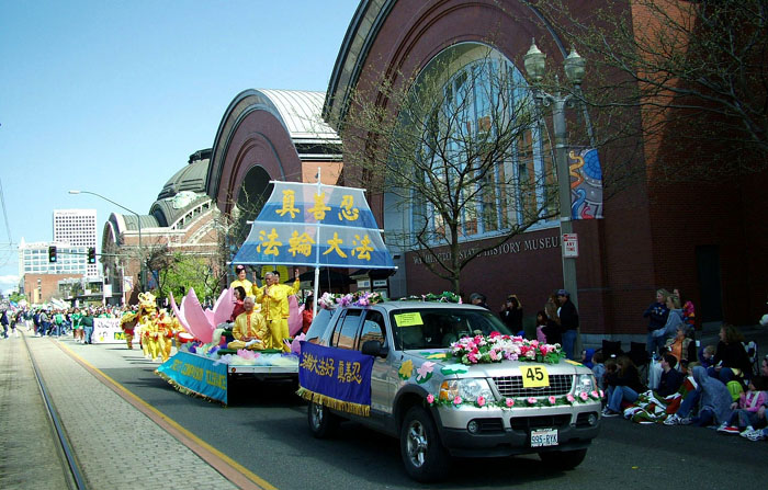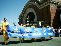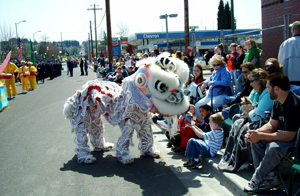 法轮功队伍由“法轮大法好”横幅、雄姿勃勃的舞狮、手持中国伞的仙女、演示功法的花车,以及腰鼓队组成;所经之处,观众掌声不断,欢呼声、赞美声此起彼伏。其中有位小朋友惊喜的说:他们大部份是中国人!