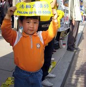 一群看上去象大陆刚出来的农民青年,板着脸扛着大“血旗”,执行任务似的站着不动。当法轮功学员去给他们讲真相时,他们也默默的在听。当学员说:“你们也够辛苦的了,来到海外要打工,还得来这执行这种任务。”他们紧绷着的脸开始放松了。当他们看到贝贝坐在他们的后面发正念时,全都转过脸来对着这个纯真的小孩笑了。他们就一边看着贝贝,一边听着学员讲真相。离开时还跟贝贝挥手说:“再见” 。
