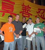 学员向一群不明真相的、手拿多面血旗的年轻留学生讲真相。