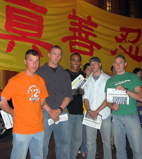 一群美国少年来到学员中间说:“我们来支持你们!”一位名叫Jason的青年说:“我们听了你们很多成员的讲述,明白了为什么今天有两群人在这里,唱着不同的歌,喊着不同的口号。” 然后他搂着刚给他们讲完迫害真相的法轮功学员戴志珍说:“我是绝对的站在这位女士的一边。”