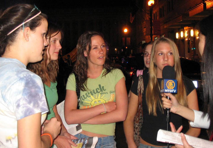 一群来自纽约一所学院的女学生,问了很多问题,学员一一做了回答。她们告诉学员说:“其实我们在他们那边(中共的欢迎队伍) ,也问了很多问题。但他们的回答令我们感觉他们特别虚伪,所以我们支持你们。” 一位女生说:“我们学校有很多来自中国的学生,我们回去要告诉他们,这种残酷的暴行正在中国发生着。”