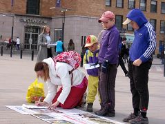 大多数路人接受了真相传单。许多人震惊于中共的残暴,签名表示对法轮功学员的支持。有些人拍着学员的肩膀赞扬法轮功学员们做的好。