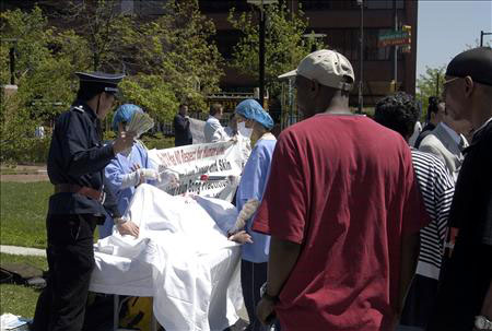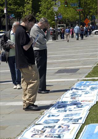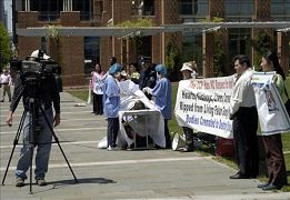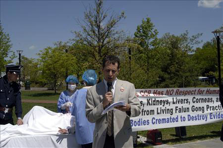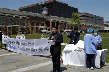 集会由杰夫逊大学医院杨景端医生主持,他感谢所有来参加集会、支持正义和良知的人们,感谢前来报导的媒体。在阳光下,现场扮演医生、护士血淋淋的活体摘取肝脏手术和中共恶警以此谋利的演示,引来很多行人驻足关注。