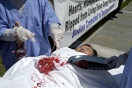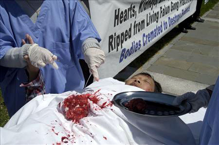 路过这里的观众吃惊的看着眼前“摘取肝脏”的一幕。一位叫凯希的女士说:“让这样的事情发生,非常非常让人伤心。我刚刚知道,这么残酷的事媒体怎么不报导?”