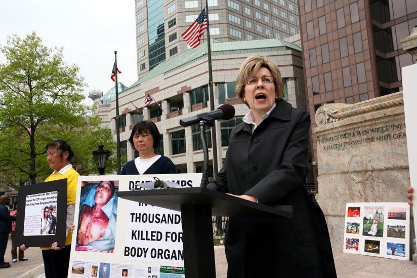 2006年4月25日,美国俄亥俄州哥伦布市的法轮功学员聚集在州政厅前的广场上,为在中国面临被屠杀、被活体摘取器官的法轮功同修们呼吁。