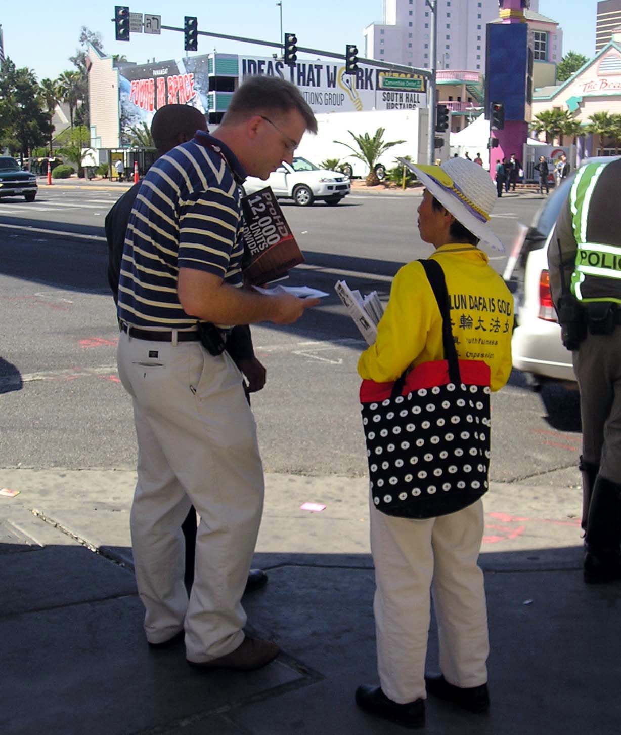 有的行人开始不接传单,他们以为是商业广告,后来看到横幅或黄T-Shirt上的法轮功几个字,就说:“法轮功的,我要。”