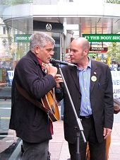 ![]() 街头艺人在游行队伍走过时也即席唱起了“不要共产党(No more CCP)” |