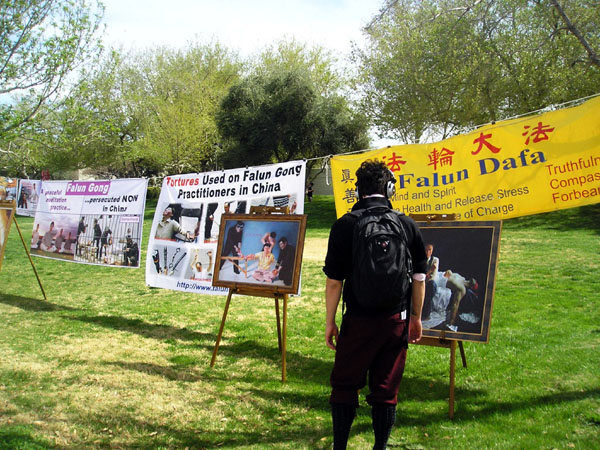 揭露中共酷刑迫害法轮功学员的横幅和油画与宁静和谐的校园形成强烈的对比;老虎凳、插竹签、灌食、吊挂、关笼子、多人踩,人们似乎闻到了皮肤被电熨斗烫糊的焦糊味,听到电棍发出刺耳的嗞嗞声,人们不敢相信这一切是真的。