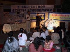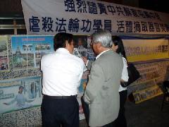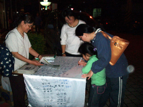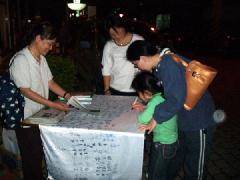 悼念活动在花莲市最热闹的旧铁道商圈,整个活动过程不断的有路过的民众围观、询问,也有些民众坐下来共同观看“新!唐!人:电视台─苏家屯特辑”、“·九·评*之五─评江泽民与中共相互利用迫害法轮功”影片。也有许多民众在了解来龙去脉之后,纷纷在征签的摊位上签下了他们的名字。
