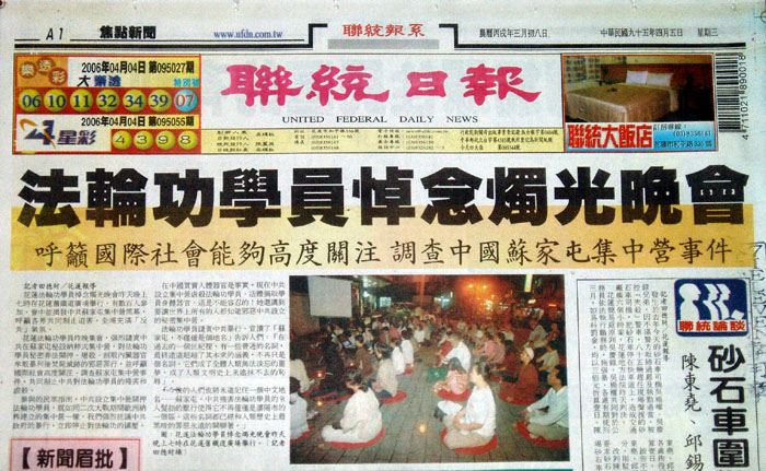 ![]() 《联统日报》以头版头条刊登法轮功学员举办悼念晚会 | ![]() 《更生日报》报导 |