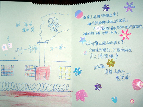 ![]() 苏志芬县长和明慧学校小朋友声援反迫害 | ![]() 明慧学校小朋友自制卡片声援反中共迫害 |