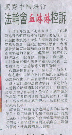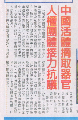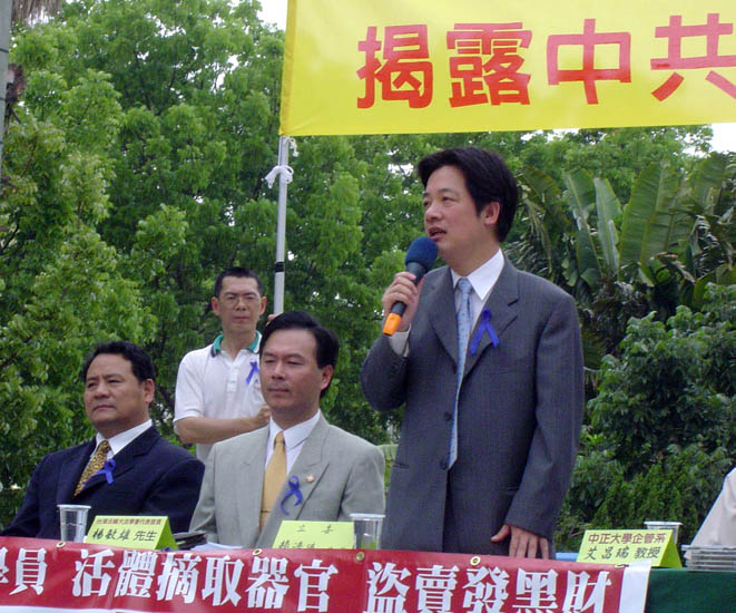 立委赖清德以身为医生的立场,呼吁台湾民众两件事:一是,不应该为了自己的健康,不分青红皂白去大陆接受器官移植,因为市场的需求会让法轮功学员或其他人成为受害者。二是,不应该只贪图中国大陆的广大市场,完全无视于中共的邪恶本质,包括对无辜民众生命的迫害,否则最后必殃及自己。
