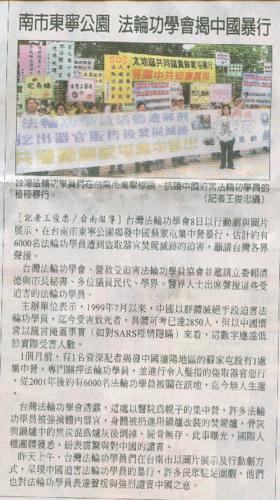 台湾法轮大法学会台南代表杨先生表示,鉴于中共为毁灭证据,大屠杀在即,2006年4月4日由法轮大法学会和明慧网发起并宣告成立“赴中国大陆全面调查法轮功受迫害真相委员会”,旨在与相关国际组织、国家机构和媒体一起,组织成联合调查团,赴中国大陆进行独立、直接、不受干预的调查和取证,全面调查有关苏家屯及其它地区秘密集中营和迫害法轮功的真相,以便尽早让真相水落石出,结束这场持续近7年的残酷迫害。