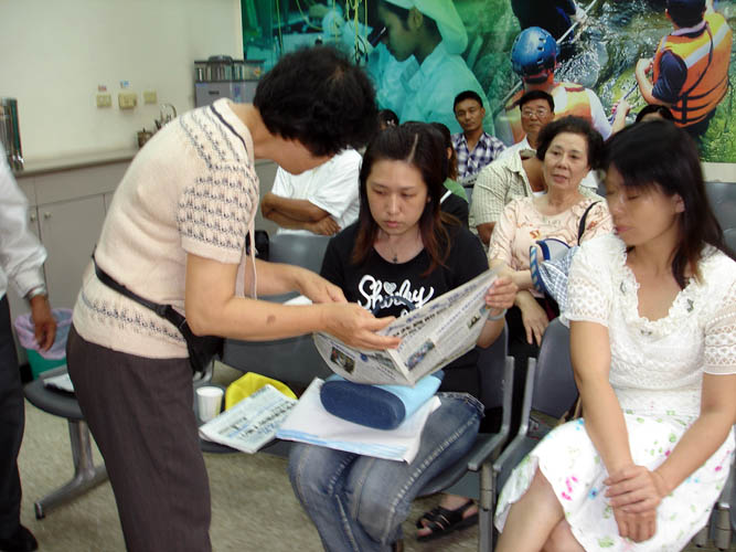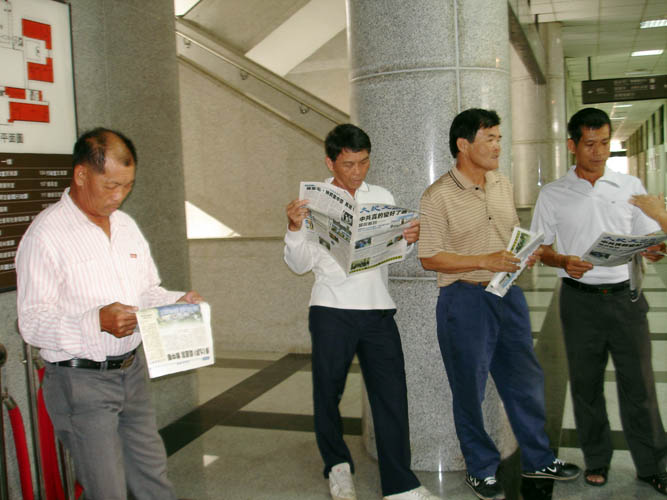 ![]() 学员向与县长有约的乡亲散发真相材料 | ![]() 民众在县政府中廊详细阅读苏家屯事件报导 |