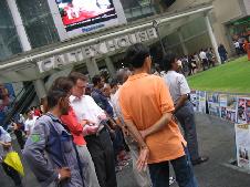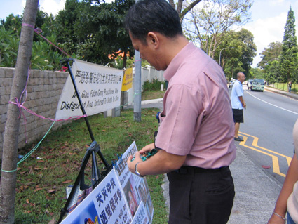 自从沈阳苏家屯集中营群体灭绝并摘取活体法轮功学员器官、焚尸灭迹的惨烈事件曝光后,新加坡法轮功学员都为此事件震惊。2006年3月22日,学员在新加坡莱佛士金融中心(Raffles Place)以展板揭露并抗议中共苏家屯集中营纳粹暴行,血腥事实令过往行人无比震惊。他们停下匆忙的脚步,认真阅读展板内容,很多人主动向学员了解进一步的情况,急切询问自己可以帮助做些什么。一位做保安工作的先生谴责中共,认为新加坡人民应参与制止这种惨无人道的罪行。