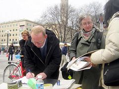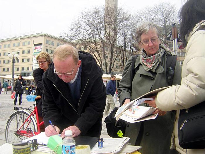 很多瑞典人走过来问发资料的法轮功学员如何才能帮那些无辜的法轮功学员,法轮功学员说,“我们要向全世界揭露中共的罪恶,请帮我们把中共的罪恶及退!党!的消息传递给你的同事和亲朋好友,让他们到网站上签名吧。”了解到共产党罪恶的人们纷纷签名,并说“支持!”“祝好运!”