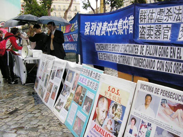 4月21日下午,大.纪.元;报社与全球.退:党!服务中心的义工们在太阳门广场将写有“声援1000万中国人退出共产党”、“强烈谴责中共群体虐杀法轮功学员、盗卖器官焚尸灭迹”的横幅挂在广场中心西班牙卡洛斯三世国王的雕像下,引得无数自此经过的人们停下脚步观看,而同时,一幅幅真实记录了中共残酷迫害信仰“真、善、忍”的法轮功学员、天主教家庭教会成员及其他中国民众的图片引起了人们强烈的关注。