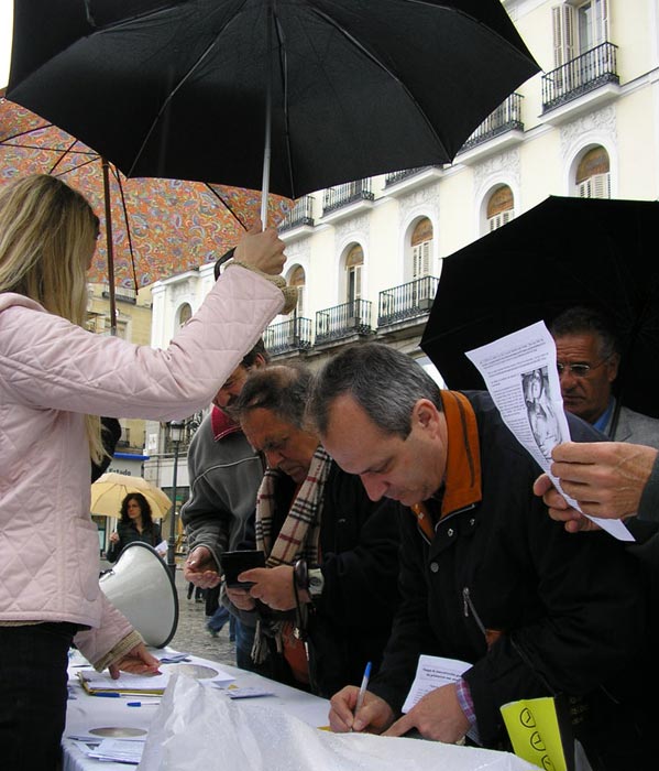 雨季的马德里天色阴沉,雨水断断续续不停的下着,但是人们仍冒雨坚持留下自己声援支持的签名。