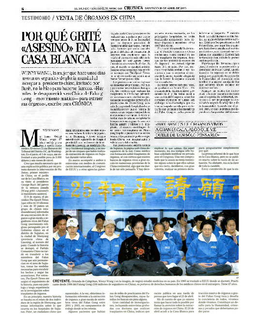 西班牙各大媒体也争相报导中国女士白宫呐喊事件,引起了人们对此事件的关注。4月30日,西班牙最大报刊之一的《世界报》整版全文登载了王文怡女士的声明。题为:“我为什么要在白宫呐喊”;副题为:“在中国有几千名失踪的法轮功学员被非法盗取器官。”