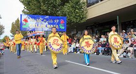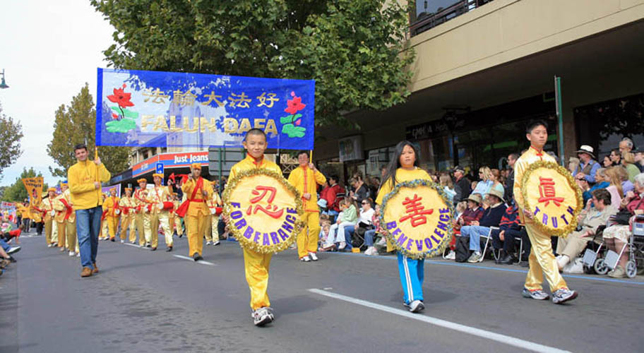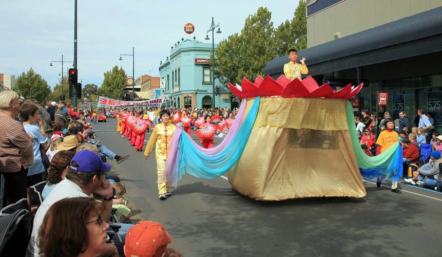 4月17日是复活节大游行,也是四天庆典活动的最高潮。一大早,班迪戈主街道两旁就坐满了前来观赏的男女老幼。当法轮大法队伍出现时,鲜艳的民族服装、优美的音乐、端庄祥和的莲花车、曼妙的扇舞引来了人们热烈的掌声和赞叹。