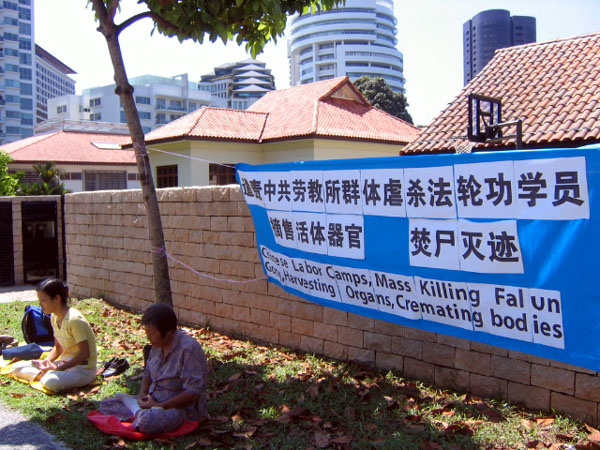 新加坡法轮功学员自2005年7月开始每天上午在中使馆前挂上横幅,抗议中共迫害法轮功,风雨不断。