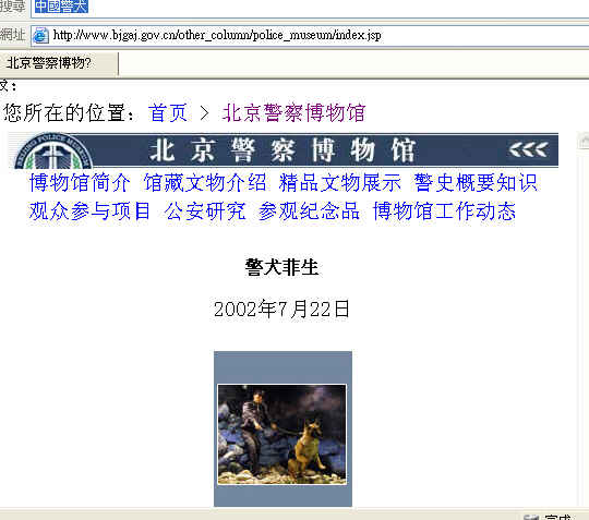相比之下,我们看到其它国家非常珍惜警犬。例如,二战时期英国将17枚勋章颁发给作战犬。2004年6月19日美国的《狗日报》上曾报导了两条警犬的非正常死亡,其中一条警犬叫“Kimbo”,是印第安那州New Albany市Floyd郡的警犬,其中一张图片报导了Kimbo的搭档警官萨姆斯(Sams)一家三口在葬礼上。当时萨姆斯难过的半捂着脸,他的小女儿则伤心躺在母亲怀里,为失去好玩伴而哭泣。另一张图片是警局领导在葬礼现场讲话,现场布置的非常隆重。而北京警界赫赫有名的功勋犬菲生也属非正常死亡,不过它不是被社会上的歹徒杀死的,而是因为中共的血腥本性而被活活宰杀的。