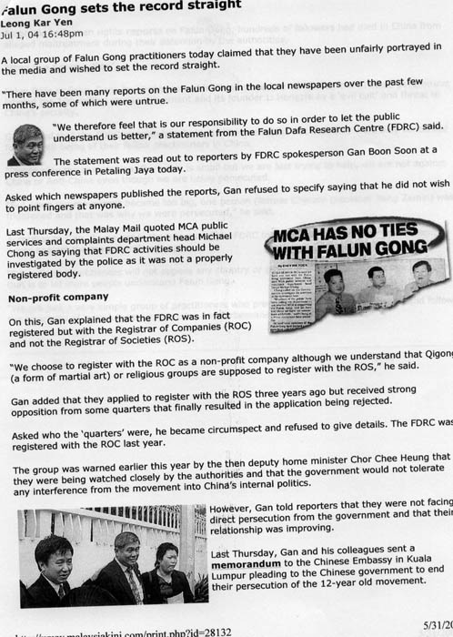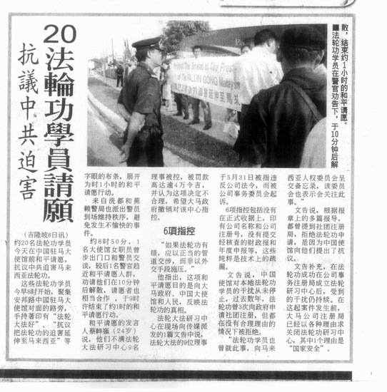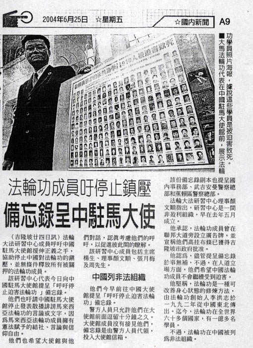 99年7月20日,中共与江氏集团迫害法轮功,马来西亚媒体直接转载中共污蔑法轮功的谎言,许多对法轮大法不理解的民众听信了媒体的报导。当时众多的人看到中共下令不准炼法轮功,就放弃炼功了。只有少部份看过《转法轮》,亲身了解和体会到法轮大法好的学员才看清中共的造谣伎俩。在这铺天盖地诬蔑大法的媒体宣传中,他们都能坚持学法炼功。