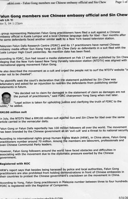 2004年初,一家华文报章刊登了一篇中使馆发出的污蔑文章。当地学员以诽谤案起诉中使馆,堂堂正正告诉马国各界:法轮大法是被迫害的,先前的(中共)造谣文章都是恶意诽谤。学员以大善大忍的精神、平和理性的方式告诉世人真相的活动,不应被邪恶扭曲,再以之毒害世人。诽谤案递上法庭后,形势可说全面扭转过来,中使馆不敢再唆使当地政府部门和报章公然污蔑大法,污蔑性的报导从此以后销声匿迹。(待续)