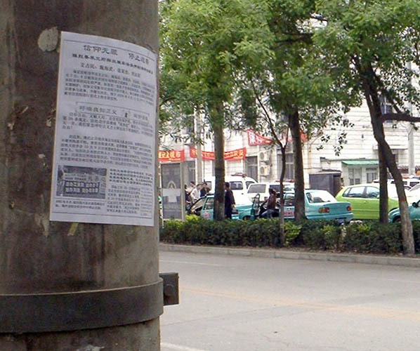 ![]() 在保定市新市区法院对面电线杆上贴着的传单。 | ![]() 保定市新市区法院门前。 |