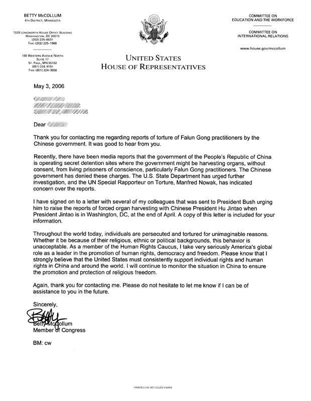 麦克康乐拇指出,现今,在世界各地都有人因令人难以想象的原因被迫害与折磨。无论是由于他们的宗教、种族或政治背景,这种行径是无法接受的。作为国会人权小组的成员,我非常重视美国在国际上推广人权、民主和自由的领导角色。请相信,我坚信美国必须始终支持中国和全世界的个人权利和人权。我将继续关注中国的状况,确保推广和保护宗教自由。