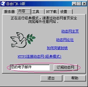 比如,我在得到一个邮箱后,经常在自由门订阅动态网。在自由门6、0的内容一栏中,输入需要讲真相的电子信箱地址,然后点“订阅动态网”就可以了。这样,邮箱主人就可以经常破网看世界了。(如下图所示)