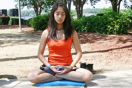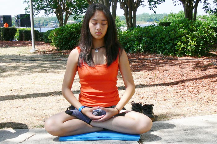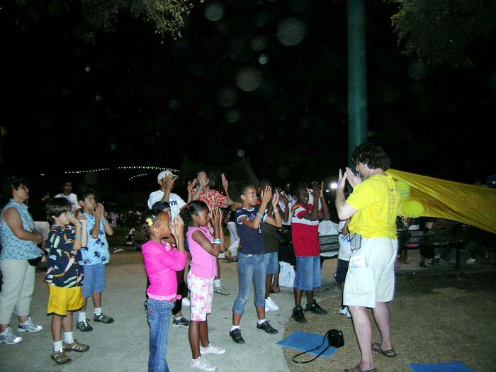 一队中学生跟学员学习打坐。他们都说感受到非常放松,平和。一个10岁的男孩在学习了折莲花和炼功后,又找来他的朋友。一位美国妇女带她的儿子来学功。她的儿子有好动症。她一直在寻找一种方法让他安静下来。学员教她的儿子打坐后,孩子说他感到很放松。在离开时一家人表示回去后要更多的了解法轮大法。