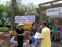 一位在佛罗里达大学读书的法轮功学员说,“我感触最深的是所有的学员都像一个整体一样合作的非常好。有中国学员、美国学员、越南学员、西班牙语系的学员,他们用他们自己民族的语言向人们洪法讲真相。许多的儿童来学习如何折莲花,在折莲花的过程中了解到迫害的真相,知道了和他们同龄的孩子正在中国受中共迫害,只是因为他们的父母不放弃对真善忍的信仰。”