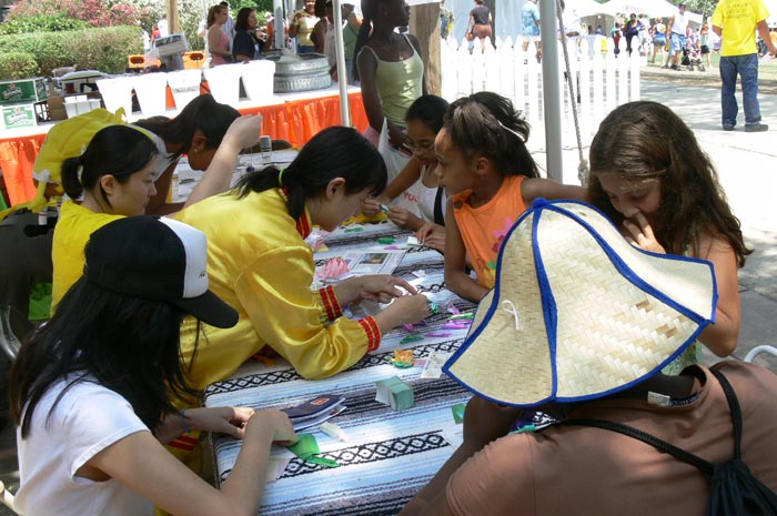 ![]() 折纸莲花也吸引了很多家庭围坐在法轮功学员身边 |
