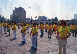 上午九时,法轮大法学员从四面八方聚集到市中心PASEO DE LOS HEROES广场各就各位开始排字炼功。学员醒目的着装,认真做着舒缓优美的动作。此时此刻此地瞬间成为引人注目的景点,车的速度放慢了,人们的脚步放慢了,开始围拢过来了。对面喜来登酒店游客的房间里不时的闪出抓拍镜头的灯光。排字结束后,游行开始。