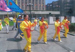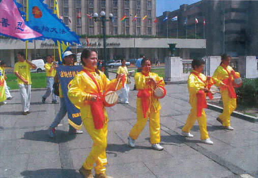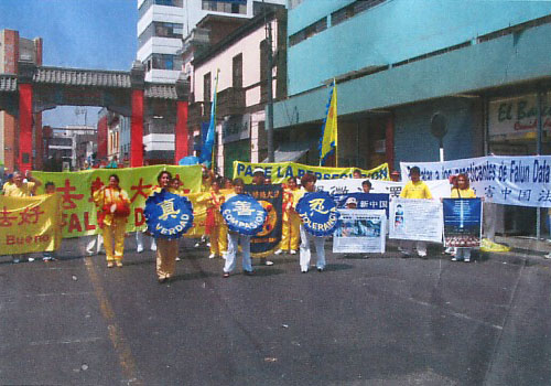 学员们手持“法轮大法”、“法轮大法好”、“真善忍”、“停止迫害法轮功学员”、“严惩江泽民”等横幅缓缓的向唐人街方向行進。最令秘鲁人耳目一新的是由四位学员组成的腰鼓“队”,人们议论着,这些从来没有见过的鼓打出的鼓点这么好听。在唐人街让华人感到惊奇的是秘鲁人打的是中国的腰鼓,而且这些人都是法轮功学员。从中国大陆来的人,看着学员向世人演示法轮功功法时,嘴巴张的老大,惊讶的问:这是法轮功吗?他们迫不及待的索取大法资料。鼓声阵阵,“法轮大法好”的声音在唐人街回荡着。下午一时三十分,游行在唐人社区的意大利广场结束。