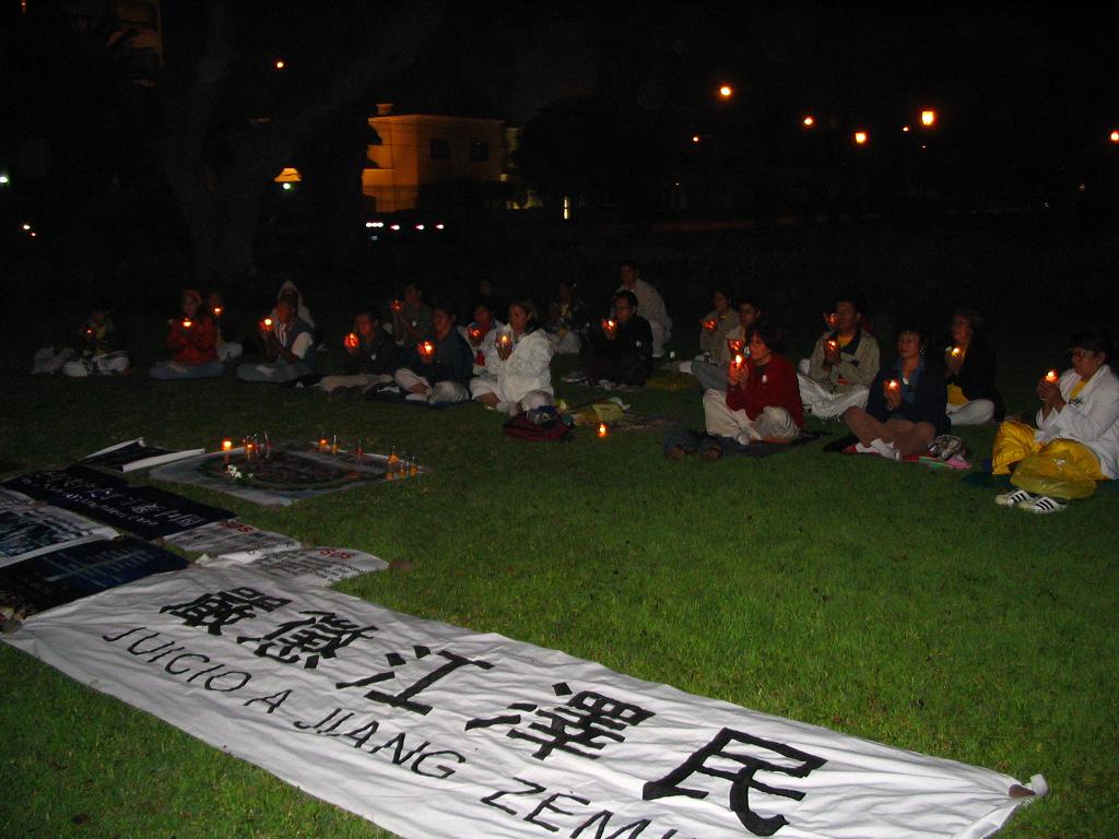 在这普天同庆的日子里,秘鲁法轮功学员们更加心系在中国大陆无辜遭受迫害的同修们。晚七时,学员在中使馆前点燃了蜡烛,悼念被中共迫害致死的中国大陆法轮功学员,并呼吁制止迫害。法轮功学员创作的歌曲一直伴随着学员们。负责守卫中使馆的武装警察对活动的缘由颇为关心,索取了法轮功真相资料。