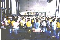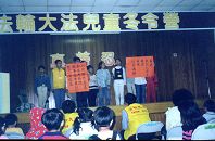 ![]() 周末文化中心草坪炼功洪法 | ![]() 小朋友分组围一圈学法 | ![]() 小朋友以话剧表现“真善忍”法理 |