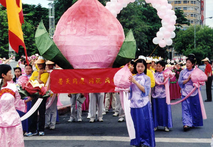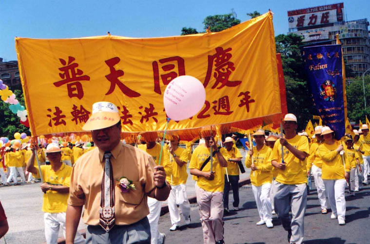 2004年,台湾各县市的法轮功学员齐聚高雄市,庆祝“世界法轮大法日”。集体炼功、园游会、舞蹈表演、音乐会及“正法之路图片展”等活动,内容精彩丰富;声势浩大的三千人大游行,更将活动推到最高点。缤纷热闹的游行队伍,绵延数公里长,颇受市民瞩目;学员热情的向沿途民众挥手高呼:“法轮大法好!”市民也回以热烈的掌声。有位旁观的太太说:“以前只听过法轮功,没想到台湾竟有那么多人在炼功。”