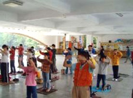 ![]() 在小港国中综合球场学功 | ![]() 成功启智学校刘钜栋校长举办并亲自参加了两次研习 | ![]() 教师们学第五套功法集体炼功 |
