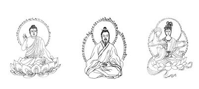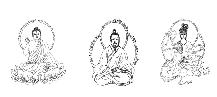外屋的墙上挂着师父亲手画的佛像,两尊女佛像,一尊阿弥陀佛、一位道和一张孙悟空的画像,庄严神圣。师父是用蜡笔画的,非常细腻,栩栩如生。其中阿弥陀佛(61页)、道(58页)和一尊女佛像(76页)就在《洪吟》的插图里(图二)。