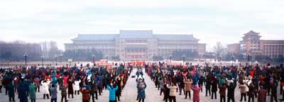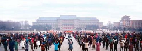 ![]() 图四:一九九八年一月一日长春地质宫门前晨炼的情景,有两千多人参加。 |