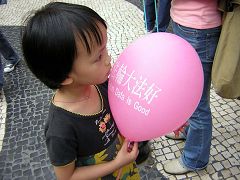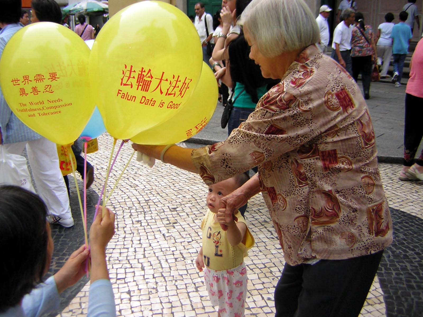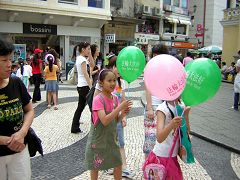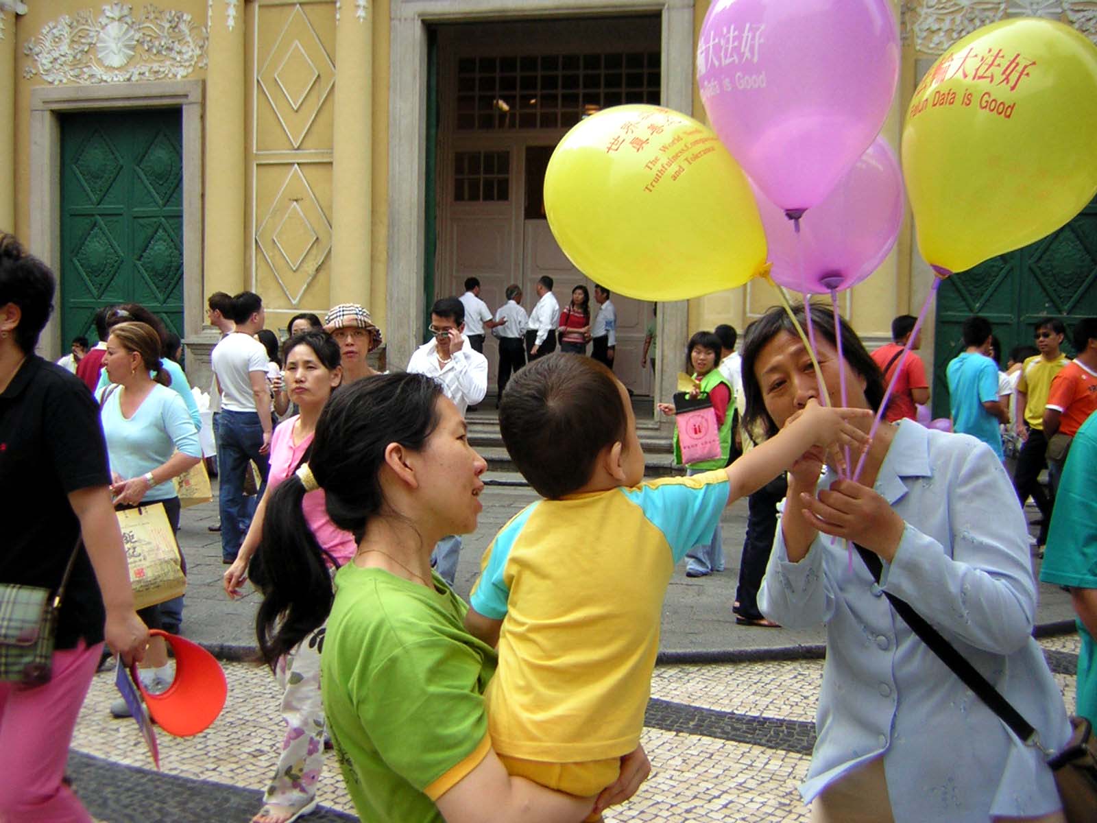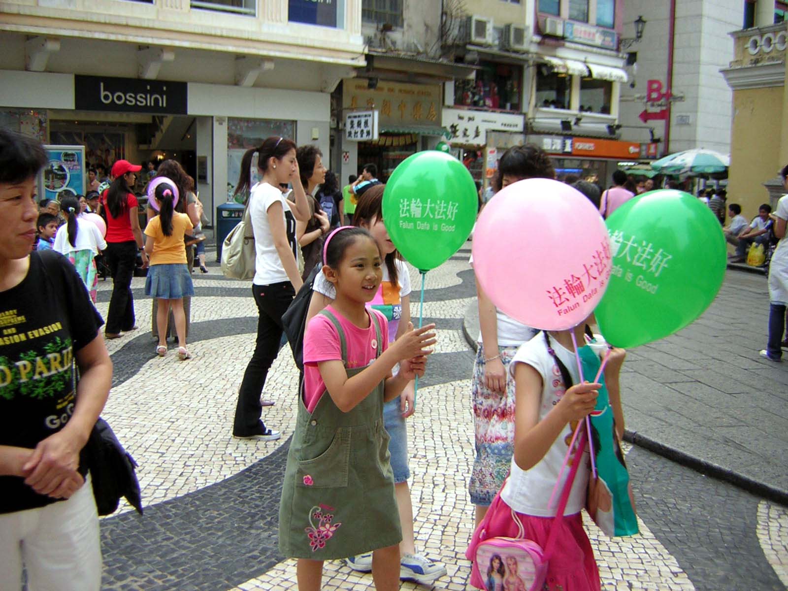 【明慧网2006年5月14日】5月13日──世界法轮大法日,为庆祝大法开传十四周年,澳门大法弟子来到市中心议事亭前地向市民派发写有“法轮大法好”、“世界需要真善忍” 字样的气球。把法轮大法的美好告诉澳门市民。小朋友们纷纷前来索取,大人们也不错过机会给家里的孩子带上一个。“法轮大法好”已在澳门人心里埋下了种子。