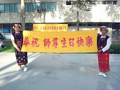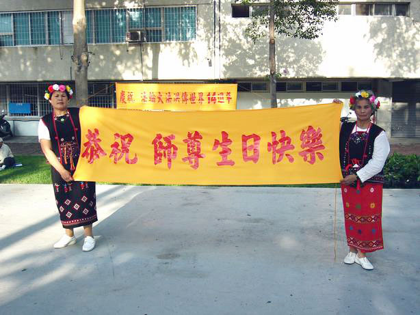 ![]() 台东学员齐聚体育场前,恭贺李老师华诞 | ![]() 原住民学员向李老师祝寿 |