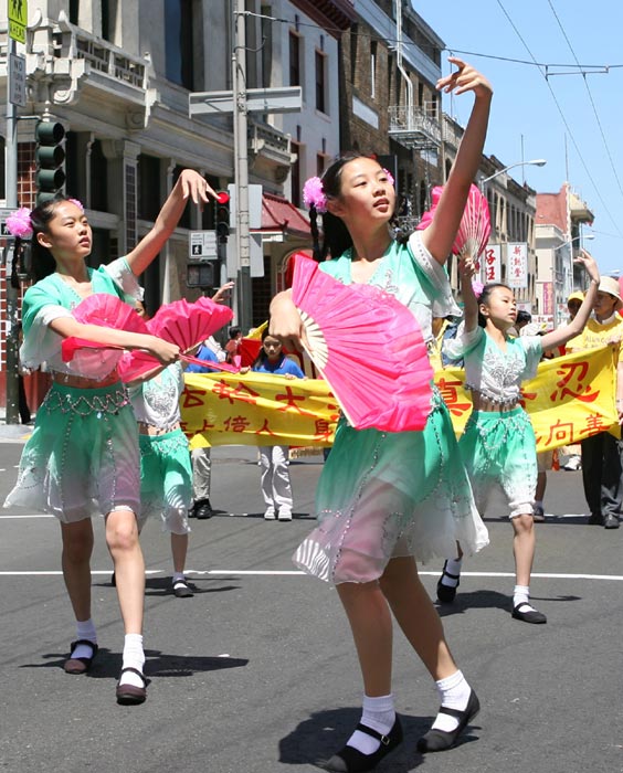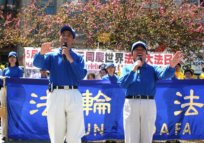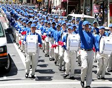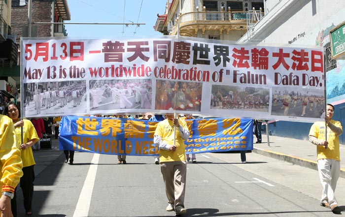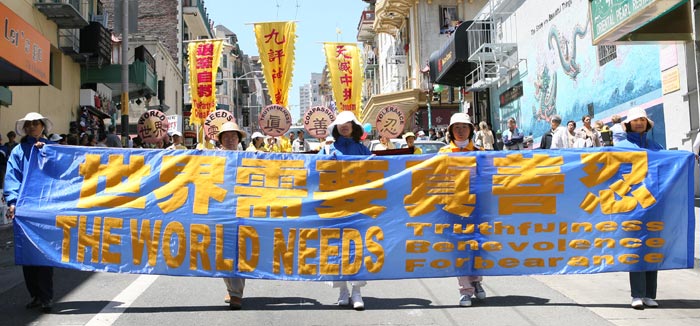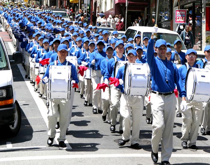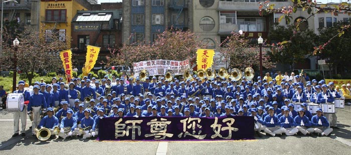 在法轮大法洪传世界14周年之际,旧金山湾区的法轮功学员在旧金山中国城,用与以往不同的方式庆祝这一节日。中午12点,刚成立一个月的美西天国乐团首次亮相,游行队伍从花园角广场出发,环绕中国城一圈,穿过繁华的中国城购物街,再回到花园角。。