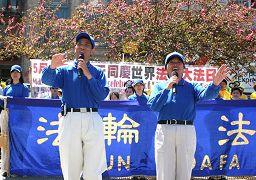 他说,我们在欢庆世界法轮大法日,但是我们不会忘记在中国受迫害的中国同修。只要迫害一天不停止,全世界的大法弟子就不会停止揭露中共的邪恶。