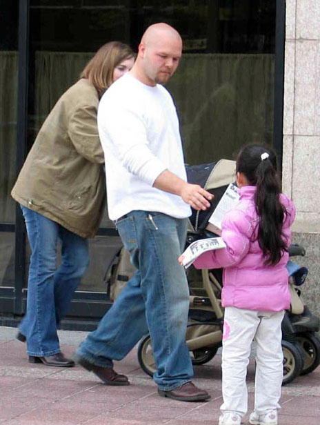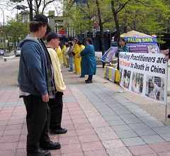 ![]() 行人驻足观看 | ![]() 小弟子派发真相资料 |