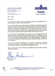 我加入整个美国的民选的领导者们共同反对在中国对法轮功的迫害。我希望2006年世界法轮大法日,对全世界法轮功修炼者为结束在中国对法轮功修炼者的非法关押而進行的和平抗争,带来显著的关注。