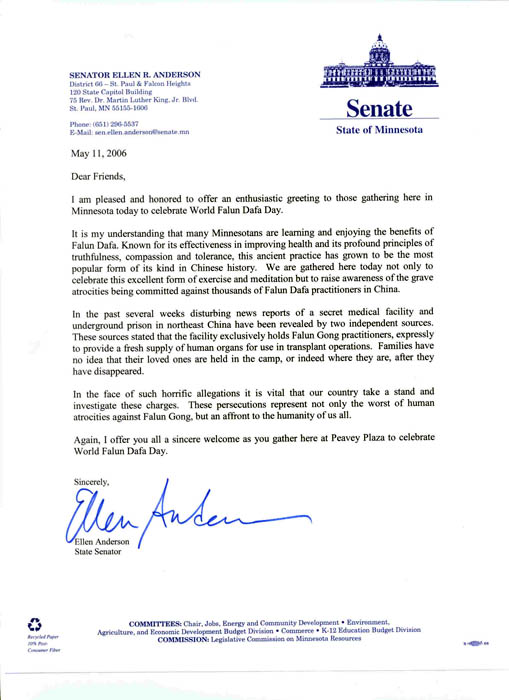 我知道许多明尼阿波利斯市及周围地区的居民喜爱修炼法轮大法这个古老的打坐炼功的修炼方式。我希望今天的活动成功,并达到你们庆祝法轮大法和分享法轮大法修炼原理的目地。