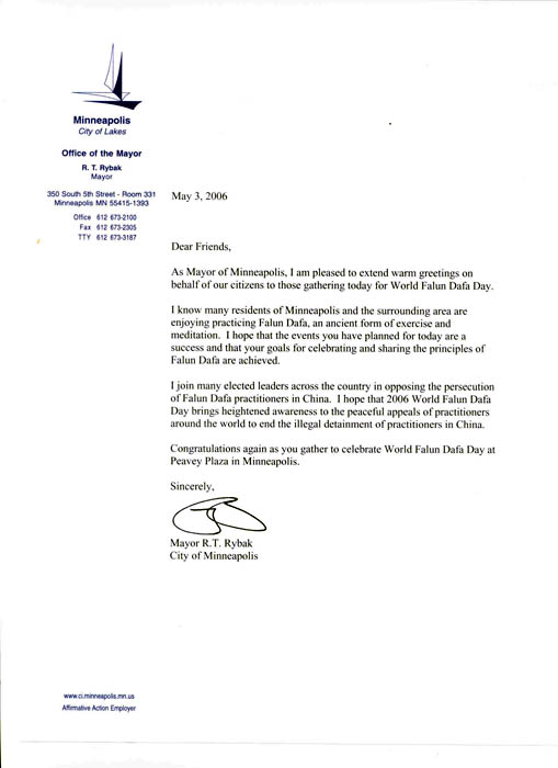 作为明尼阿波利斯市市长,我代表我们的市民,高兴的对那些今天庆贺法轮大法日的人们表示热烈的祝贺。